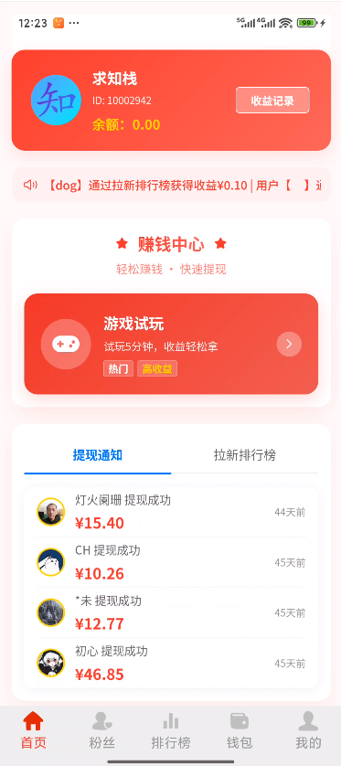 - 4、滚动通知栏(含提现通知、拉新排行榜)