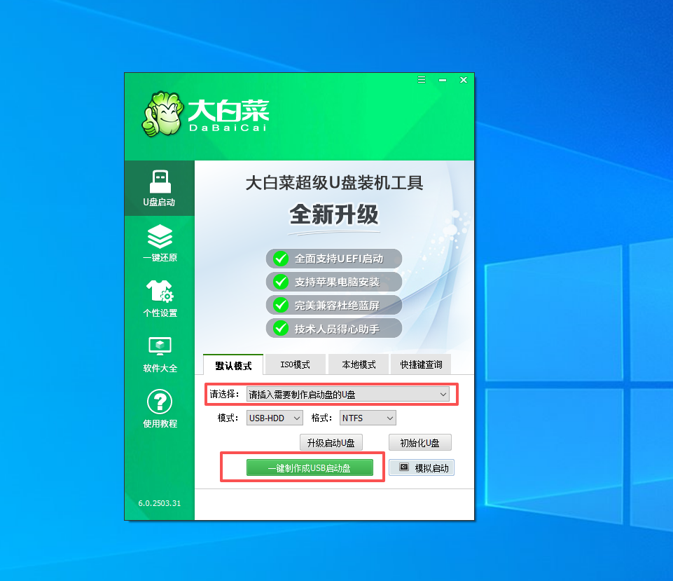 制作一个U盘启动盘 工具 52 3 小时 前 0 浮生若梦 站长的B站视频教程:制作U盘启动盘 1、下载一个制作工具,大白菜U盘启动盘制作工具 2、双击运行 DaBaiCai.exe,打开如下界面 3、在上图中,选择你的U盘,点击一键制作成USB启动盘即可 点赞