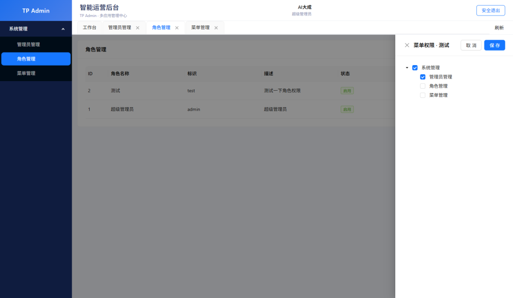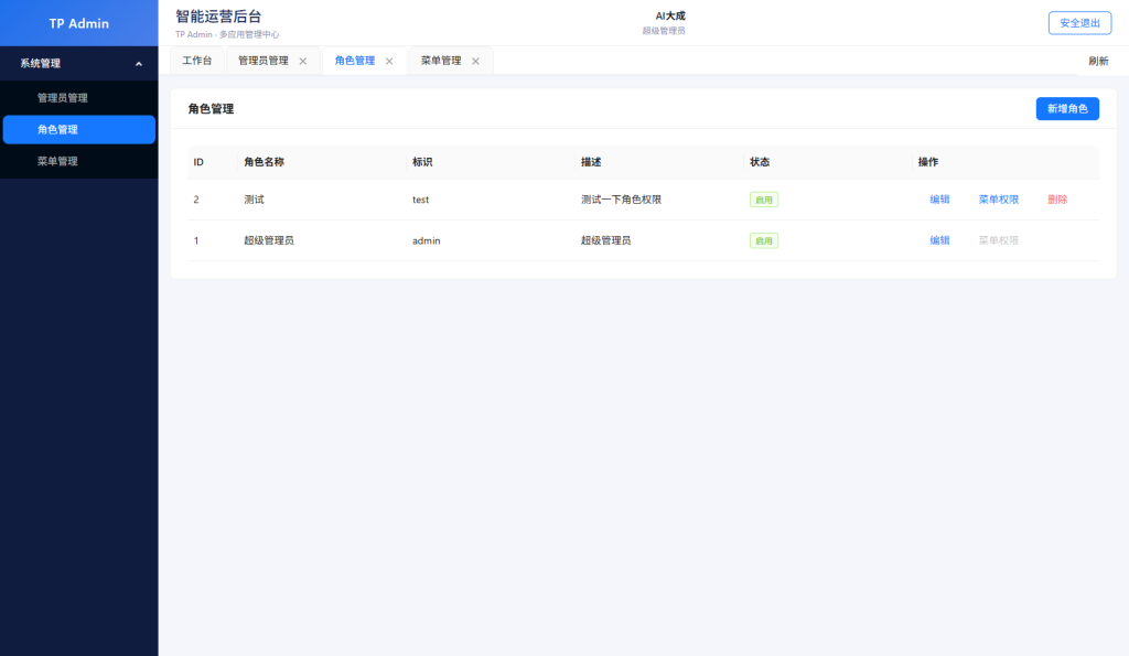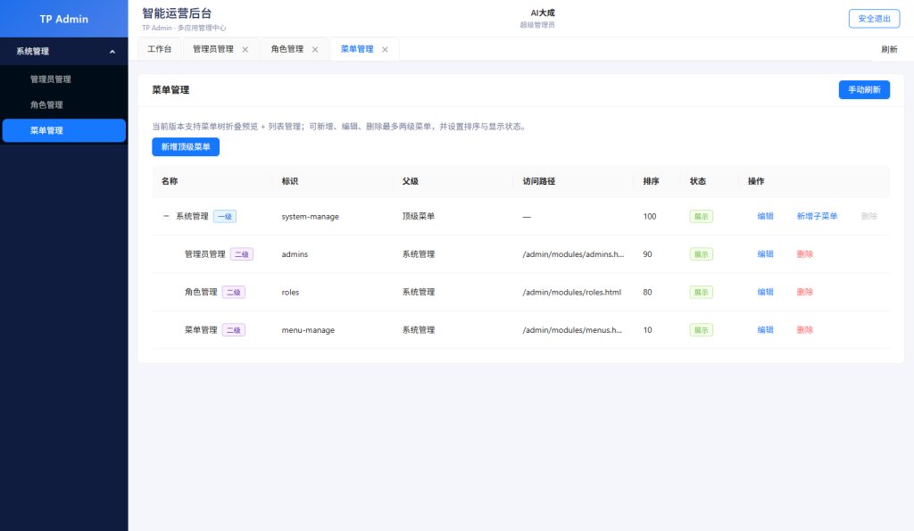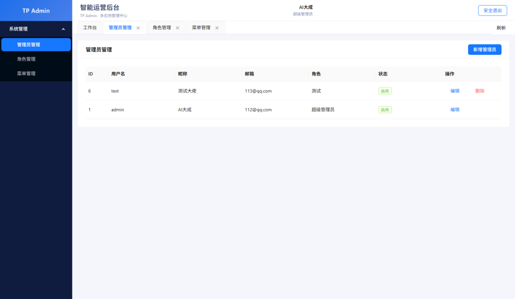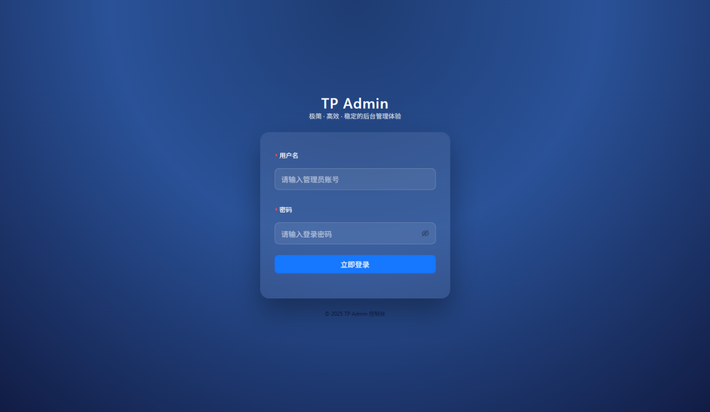 AI全自动生成的后台管理系统源码(含数据库) 产品 6 11 分 前 0 浮生若梦 开场提示词: 在当前目录下创建一个thinkphp项目,你可以使用系统中全局php 和 composer命令 ,数据库地址:192.168.2.151 数据库名:tp_admin 账号:root 密码:xgYg12P_nN0r;要求具备一个多应用扩展,数据库迁移扩展; 后面自己根据项目需要进行提示词的调整即可 后台管理系统登陆页面: 后台管理系统功能页面 菜单管理 角色管理 管理员管理 下载得到内容 点赞 资源下载地址 该资源需登录后下载去登录 温馨提示:本资源来源于互联网,仅供参考学习使用。若该资源侵犯了您的权益,请 联系我们 处理。